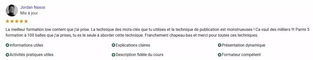 À la fin de la formation, tu as ton système complet pour faire des comparatifs de produits, que tu utilises Amazon ou d’autres programmes en affiliation. Le tout par copier-coller.