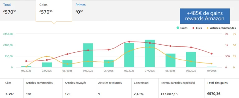 La chaîne a été lancée le 19 janvier, elle a rapporté 570€ de commission en affiliation + 485€ de revenus rewards Amazon (primes de performances) pour 13887€ de CA, 7397 clics et 181 articles commandés. Ce n’est que le début. Un moyen facile de se générer un complément de revenus.